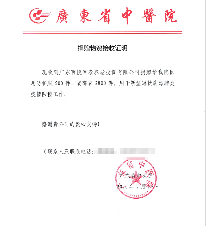 廣東祥利集團旗下的廣東百悅百泰養老投資有限公司情系廣東省中醫院,于2月19日向該院捐贈500件防護服、2800件隔離衣。詳細 >>>